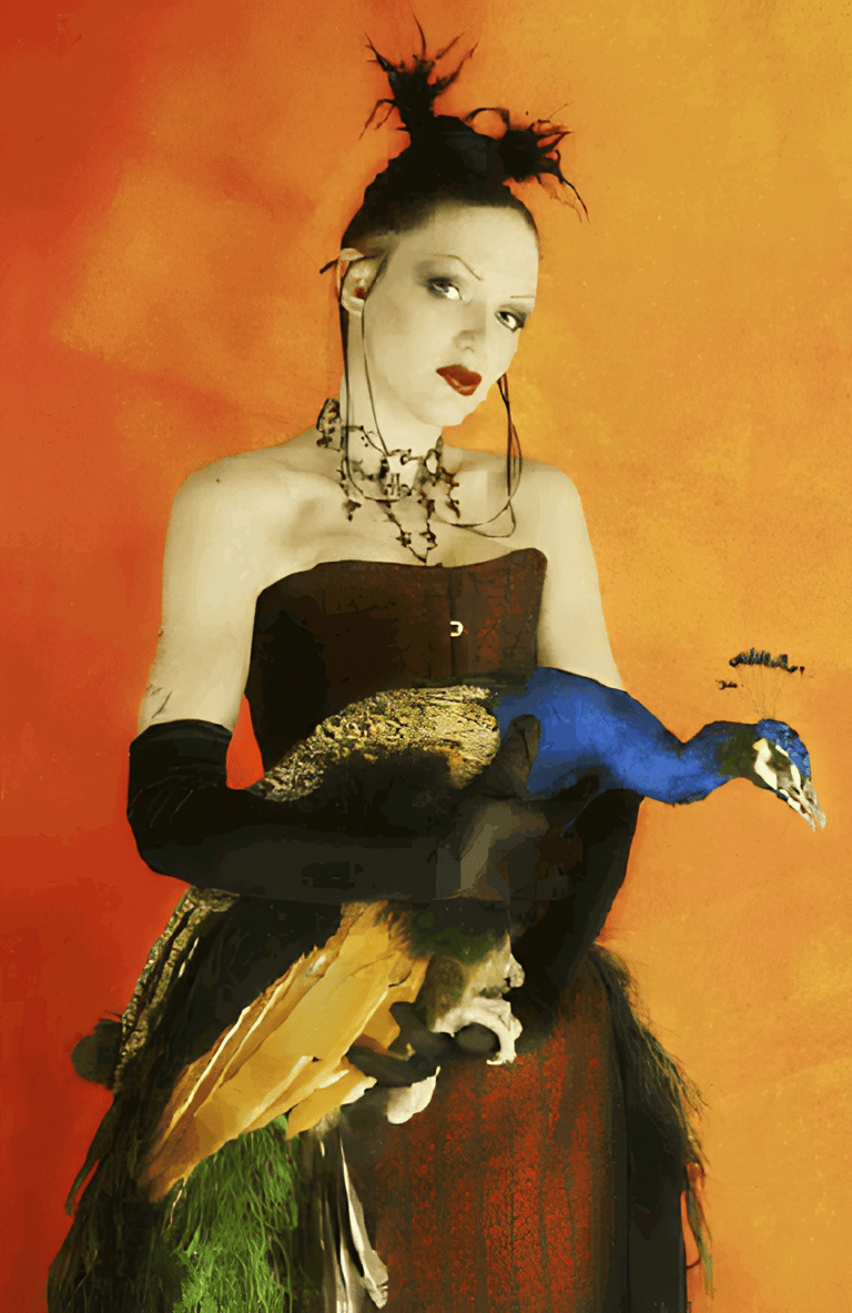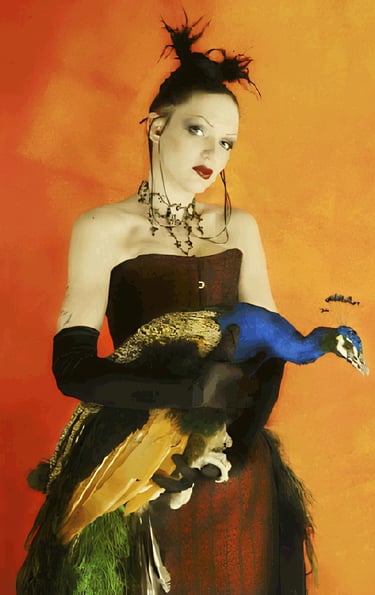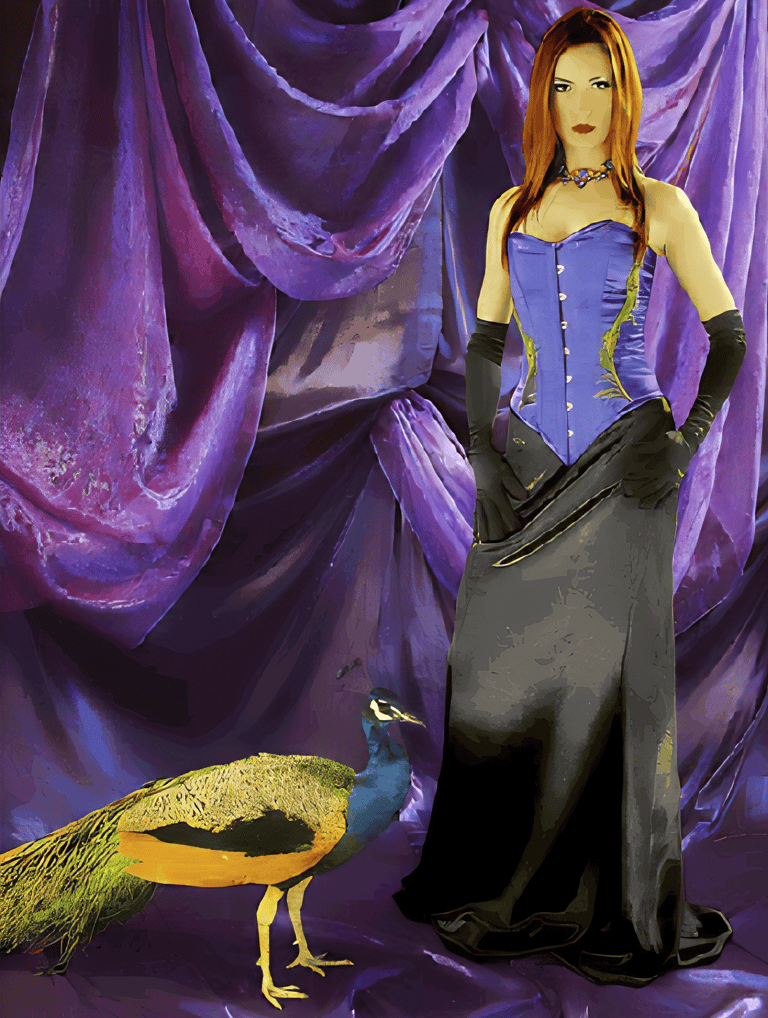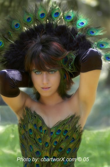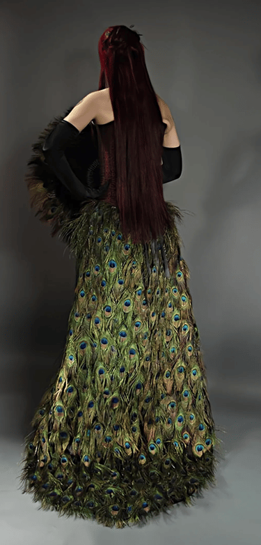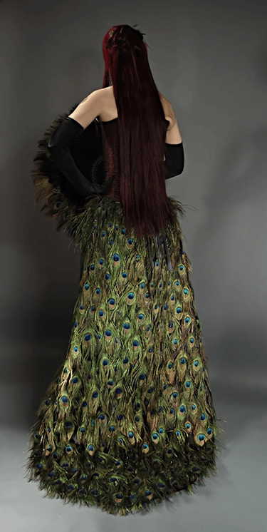 Peacock feather corset created by Foxglove® (Suzanne Clements), featured in The New York Times Fantasy Photo Tour article